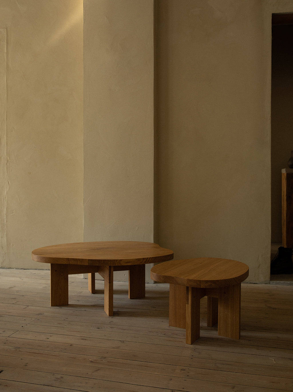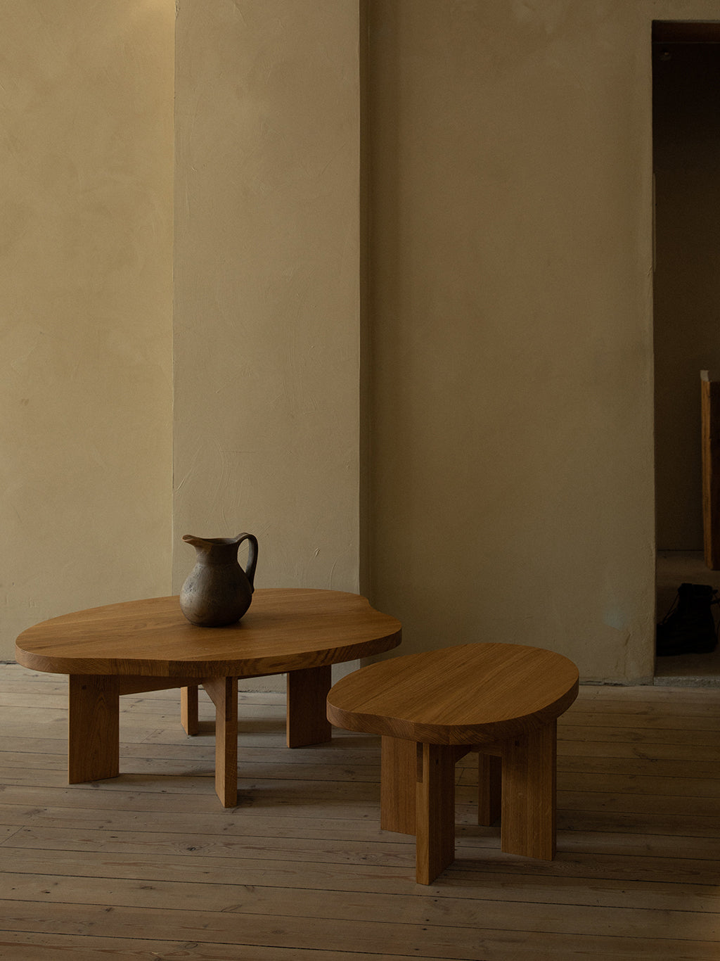 The Farmhouse Coffee Table Pond in natural oak is a uniquely sculptural and organic pond-shaped table design featuring a rich, deep finish and fluid aesthetic. Crafted in high-quality solid oak, supported by trestles, the low wooden coffee table serves as a focal point in any living space.