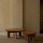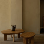 The pond shaped wooden coffee table is inspired by the architectural elements of traditional farmhouses, paying tribute to the elegance and malleability of wood.